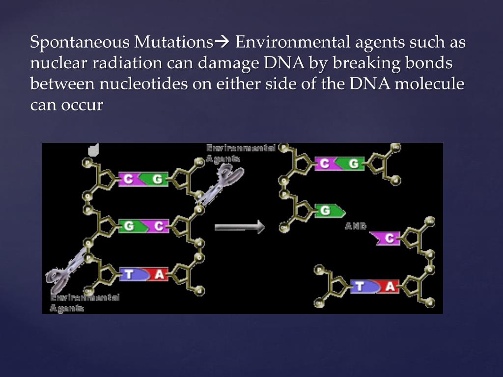 Spontaneous Mutations Environmental agents such as nuclear radiation can damage DNA by breaking bonds between nucleotides on either side of the DNA molecule can occur