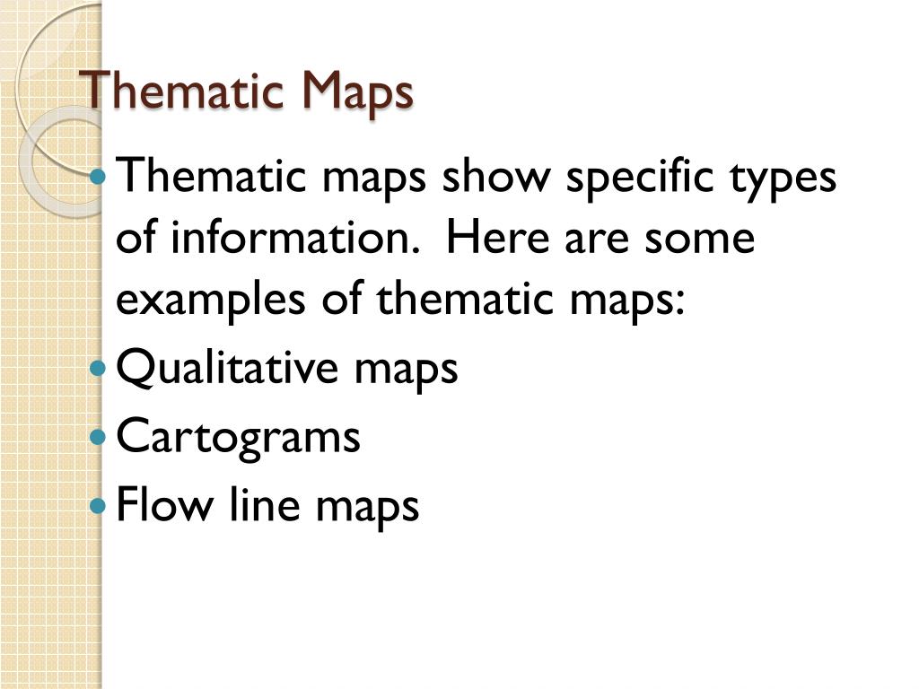 Thematic Maps • Thematic maps show specific types of information. Here are some examples of thematic maps: • Qualitative maps • Cartograms • Flow line maps