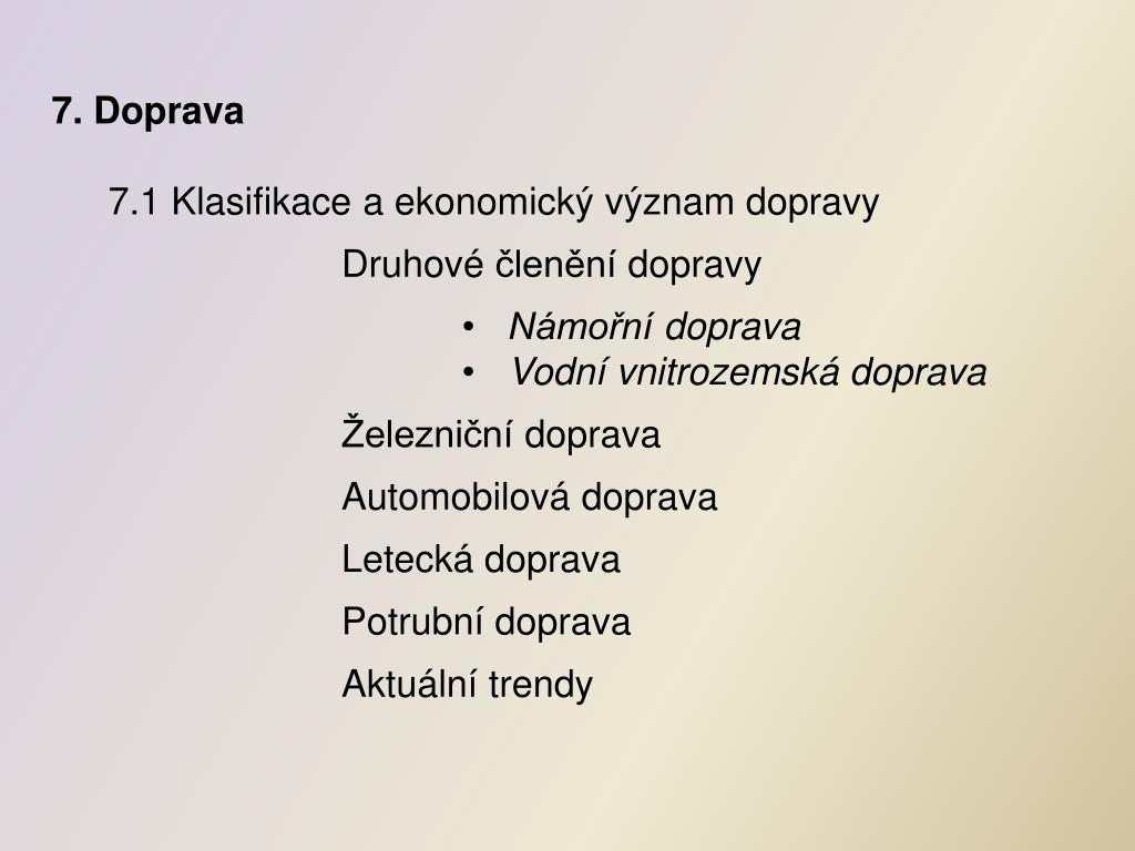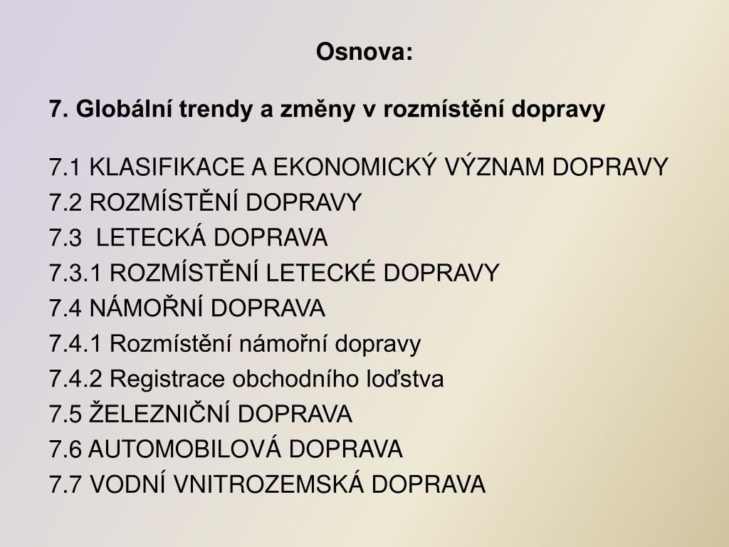 Osnova: 7. Globální trendy a změny v rozmístění dopravy 7.1 Klasifikace a ekonomický význam dopravy 7.2 Rozmístění dopravy 7.3 Letecká doprava 7.3.1 Rozmístění letecké dopravy 7.4 Námořní doprava 7.4.1 Rozmístění námořní dopravy 7.4.2 Registrace obchodního loďstva 7.5 Železniční doprava 7.6 Automobilová doprava 7.7 Vodní vnitrozemská doprava
