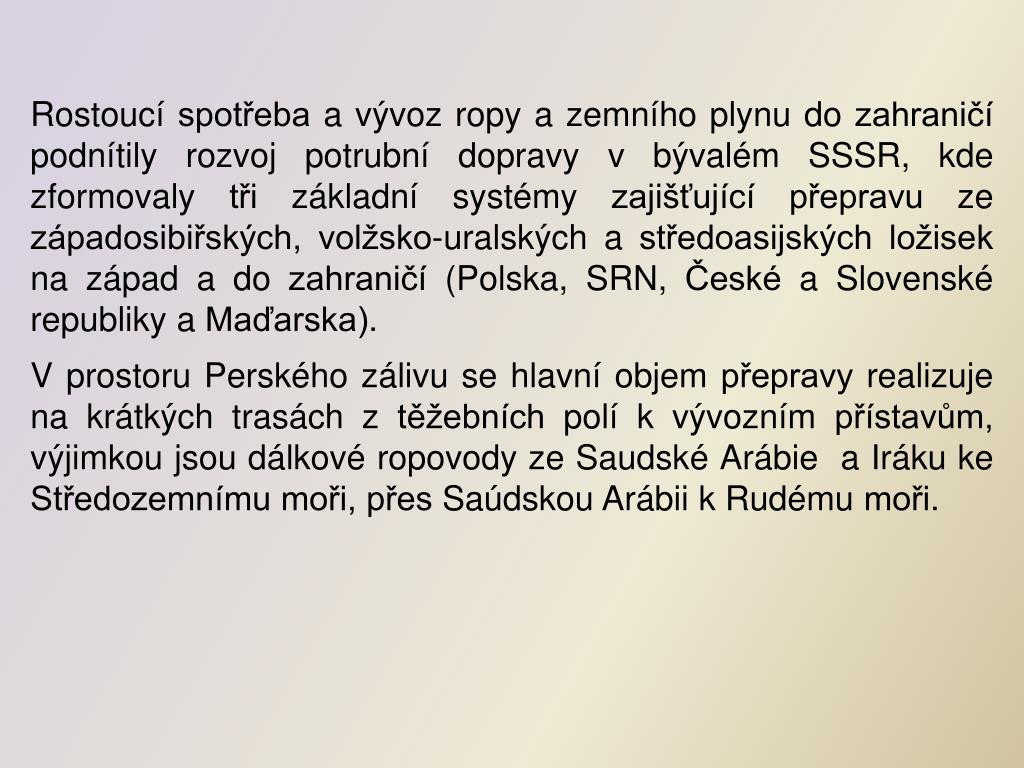 Rostoucí spotřeba a vývoz ropy a zemního plynu do zahraničí podnítily rozvoj potrubní dopravy v bývalém SSSR, kde zformovaly tři základní systémy zajišťující přepravu ze západosibiřských, volžsko-uralských a středoasijských ložisek na západ a do zahraničí (Polska, SRN, České a Slovenské republiky a Maďarska). V prostoru Perského zálivu se hlavní objem přepravy realizuje na krátkých trasách z těžebních polí k vývozním přístavům, výjimkou jsou dálkové ropovody ze Saudské Arábie a Iráku ke Středozemnímu moři, přes Saúdskou Arábii k Rudému moři.