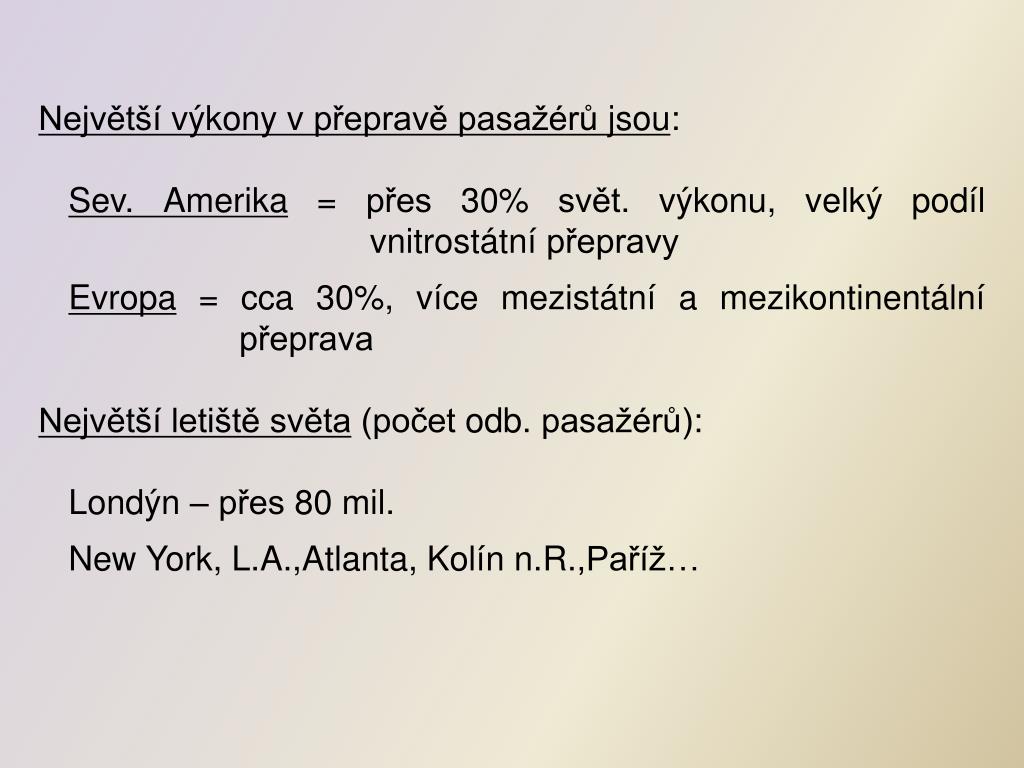 Největší výkony v přepravě pasažérů jsou: Sev. Amerika = přes 30% svět. výkonu, velký podíl vnitrostátní přepravy Evropa = cca 30%, více mezistátní a mezikontinentální přeprava Největší letiště světa (počet odb. pasažérů): Londýn – přes 80 mil. New York, L.A.,Atlanta, Kolín n.R.,Paříž…