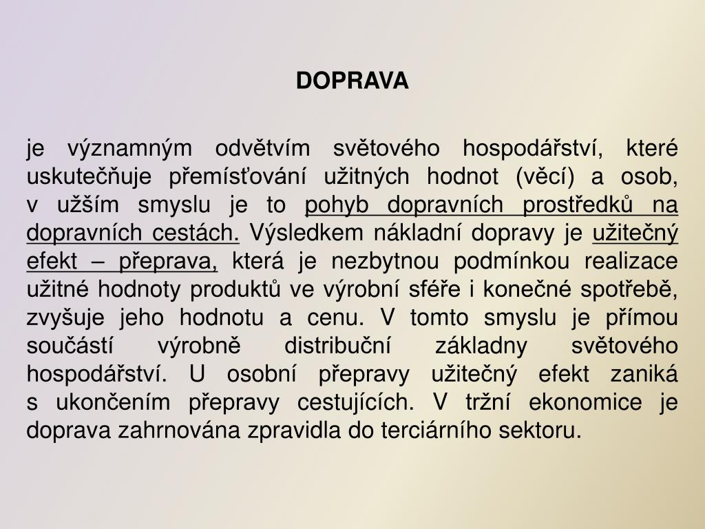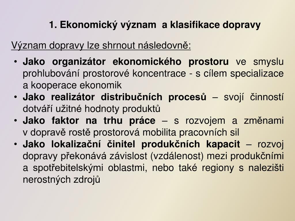 Ekonomický význam a klasifikace dopravy Význam dopravy lze shrnout následovně: • Jako organizátor ekonomického prostoru ve smyslu prohlubování prostorové koncentrace - s cílem specializace a kooperace ekonomik • Jako realizátor distribučních procesů – svojí činností dotváří užitné hodnoty produktů • Jako faktor na trhu práce – s rozvojem a změnami v dopravě rostě prostorová mobilita pracovních sil • Jako lokalizační činitel produkčních kapacit – rozvoj dopravy překonává závislost (vzdálenost) mezi produkčními a spotřebitelskými oblastmi, nebo také regiony s nalezišti nerostných zdrojů