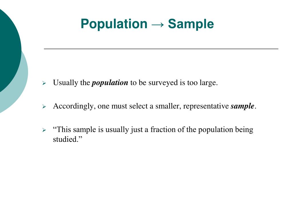 Population → Sample • Usually the population to be surveyed is too large. • Accordingly, one must select a smaller, representative sample. • “This sample is usually just a fraction of the population being studied.”