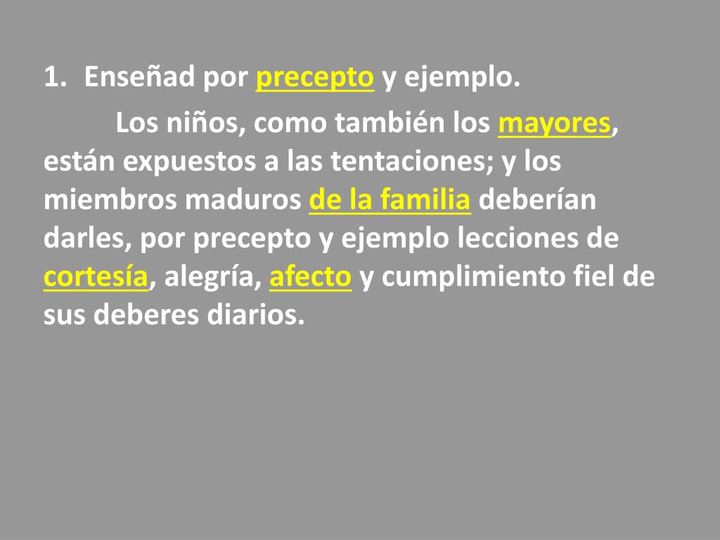 Enseñad por precepto y ejemplo. Los niños, como también los mayores, están expuestos a las tentaciones; y los miembros maduros de la familiadeberían darles, por precepto y ejemplo lecciones de cortesía, alegría, afecto y cumplimiento fiel de sus deberes diarios.