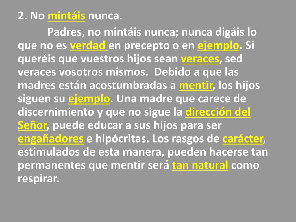 2. No mintáis nunca. Padres, no mintáis nunca; nunca digáis lo que no es verdaden precepto o en ejemplo. Si queréis que vuestros hijos sean veraces, sed veraces vosotros mismos. Debido a que las madres están acostumbradas a mentir, los hijos siguen su ejemplo. Una madre que carece de discernimiento y que no sigue la dirección del Señor, puede educar a sus hijos para ser engañadores e hipócritas. Los rasgos de carácter, estimulados de esta manera, pueden hacerse tan permanentes que mentir será tan naturalcomo respirar.