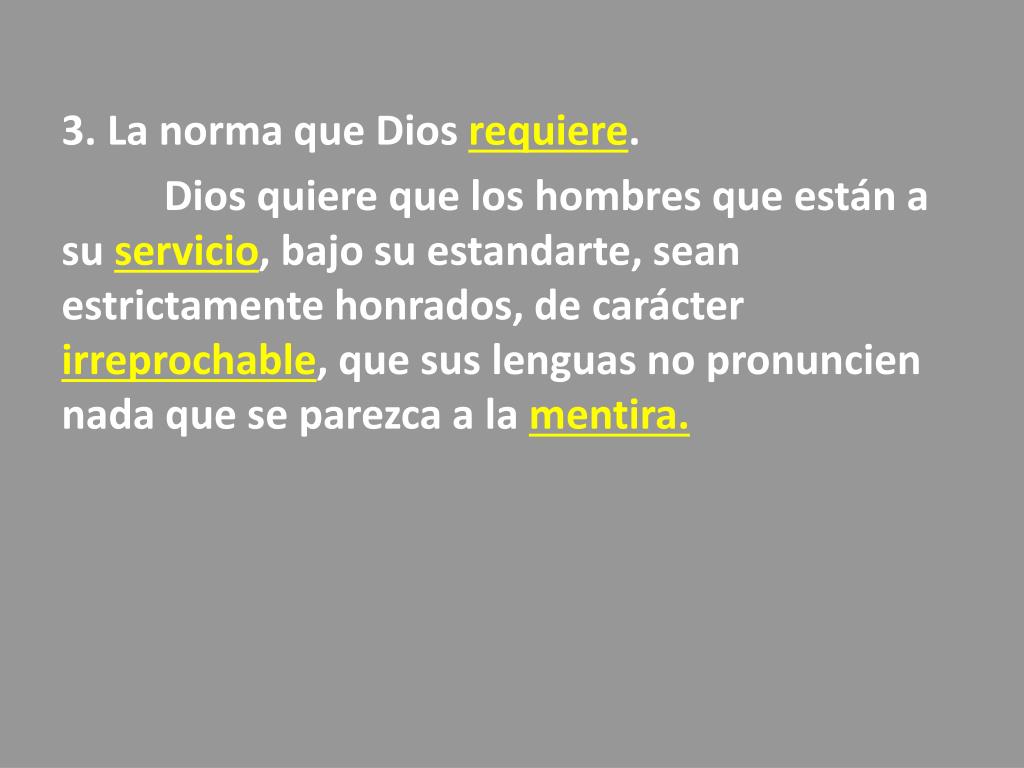 3. La norma que Dios requiere. Dios quiere que los hombres que están a su servicio, bajo su estandarte, sean estrictamente honrados, de carácter irreprochable, que sus lenguas no pronuncien nada que se parezca a la mentira.