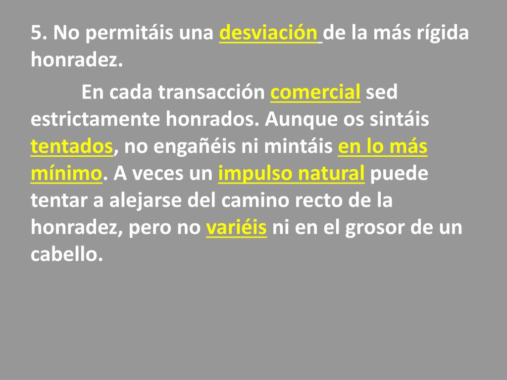 5. No permitáis una desviaciónde la más rígida honradez. En cada transacción comercial sed estrictamente honrados. Aunque os sintáis tentados, no engañéis ni mintáis en lo más mínimo. A veces un impulso naturalpuede tentar a alejarse del camino recto de la honradez, pero no variéis ni en el grosor de un cabello.