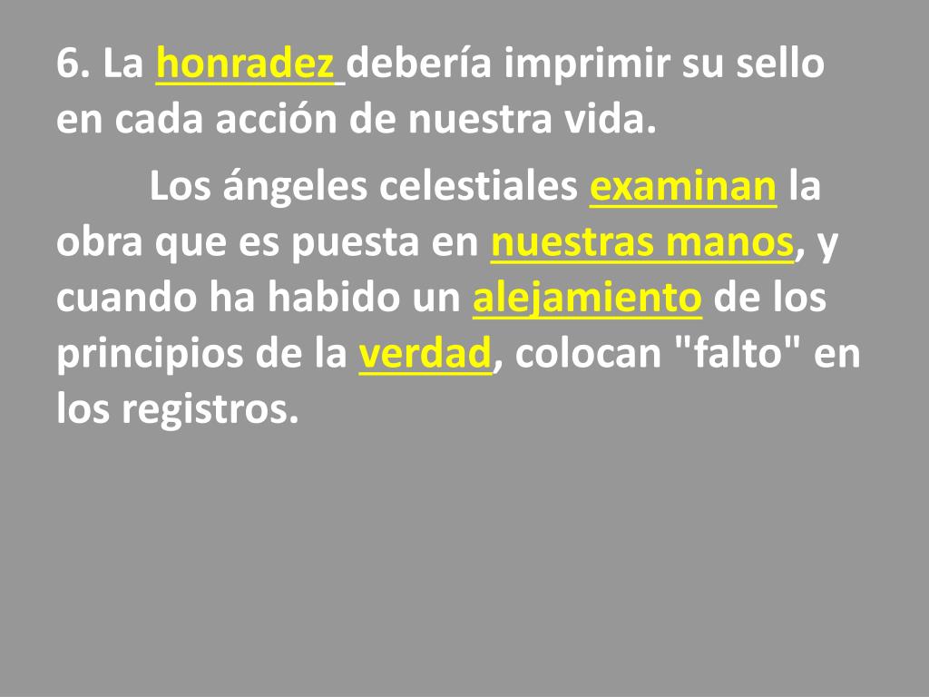 6. La honradezdebería imprimir su sello en cada acción de nuestra vida. Los ángeles celestiales examinan la obra que es puesta en nuestras manos, y cuando ha habido un alejamiento de los principios de la verdad, colocan "falto" en los registros.