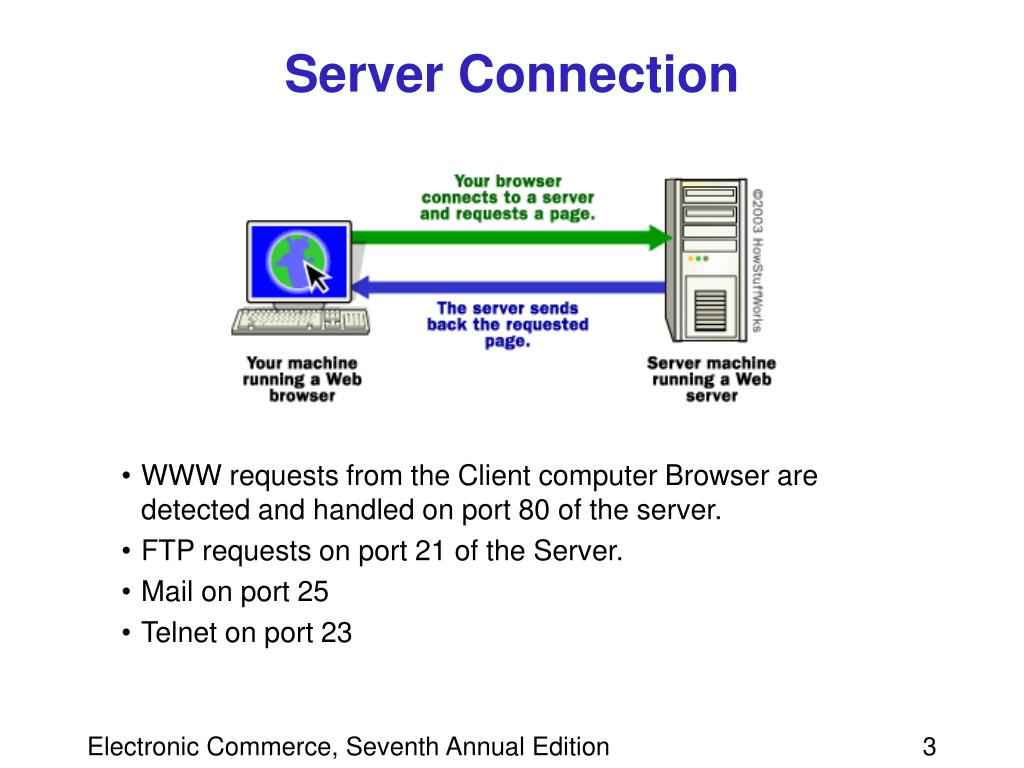 Server Connection • WWW requests from the Client computer Browser are detected and handled on port 80 of the server. • FTP requests on port 21 of the Server. • Mail on port 25 • Telnet on port 23 Electronic Commerce, Seventh Annual Edition