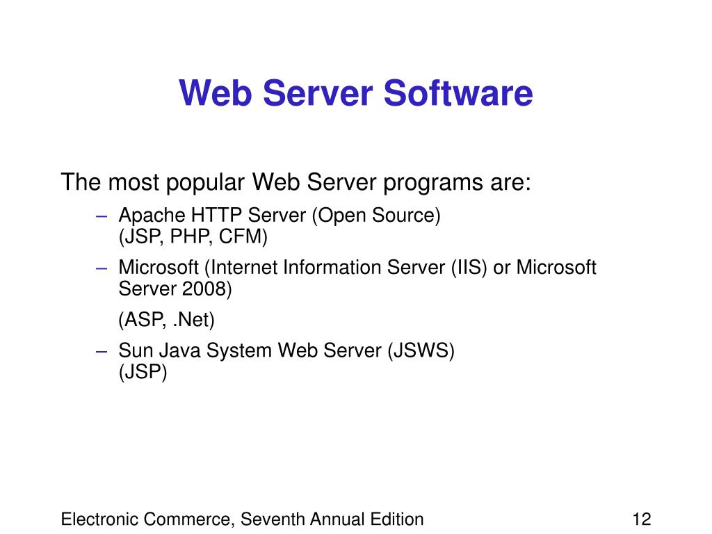 Web Server Software The most popular Web Server programs are: • Apache HTTP Server (Open Source)(JSP, PHP, CFM) • Microsoft (Internet Information Server (IIS) or Microsoft Server 2008) (ASP, .Net) • Sun Java System Web Server (JSWS) (JSP) Electronic Commerce, Seventh Annual Edition