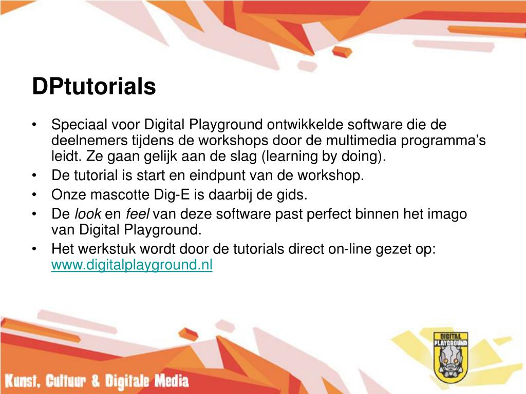 DPtutorials • Speciaal voor Digital Playground ontwikkelde software die de deelnemers tijdens de workshops door de multimedia programma’s leidt. Ze gaan gelijk aan de slag (learning by doing). • De tutorial is start en eindpunt van de workshop. • Onze mascotte Dig-E is daarbij de gids. • De look en feel van deze software past perfect binnen het imago van Digital Playground. • Het werkstuk wordt door de tutorials direct on-line gezet op: www.digitalplayground.nl