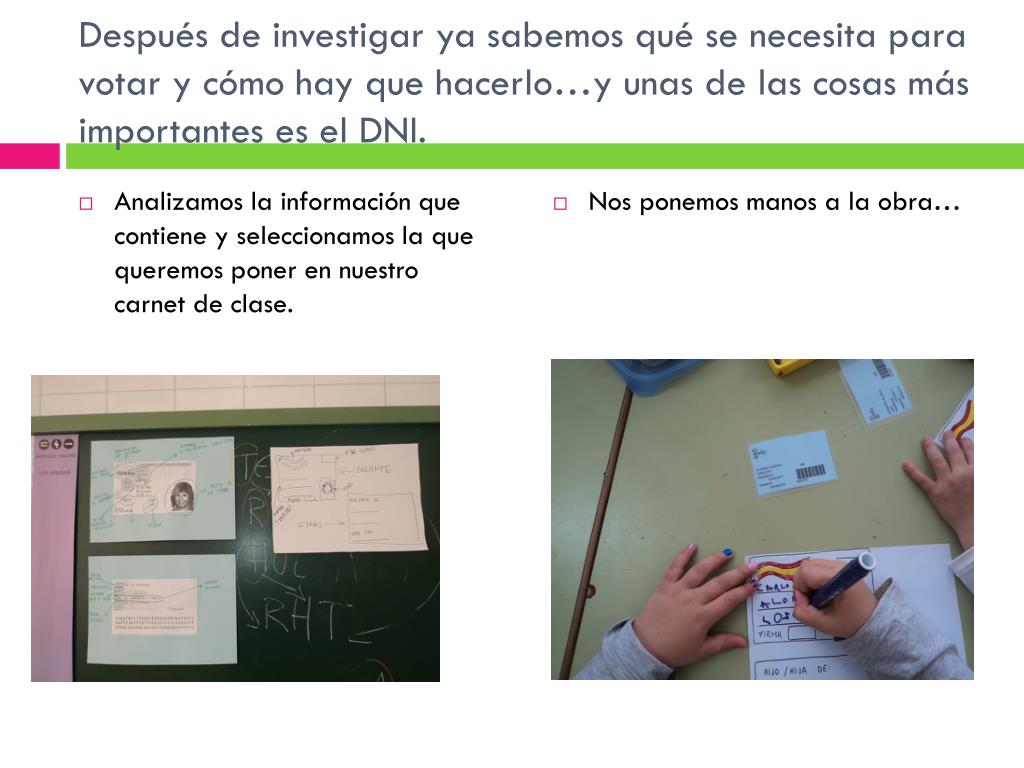 Después de investigar ya sabemos qué se necesita para votar y cómo hay que hacerlo…y unas de las cosas más importantes es el DNI. • Analizamos la información que contiene y seleccionamos la que queremos poner en nuestro carnet de clase. • Nos ponemos manos a la obra…