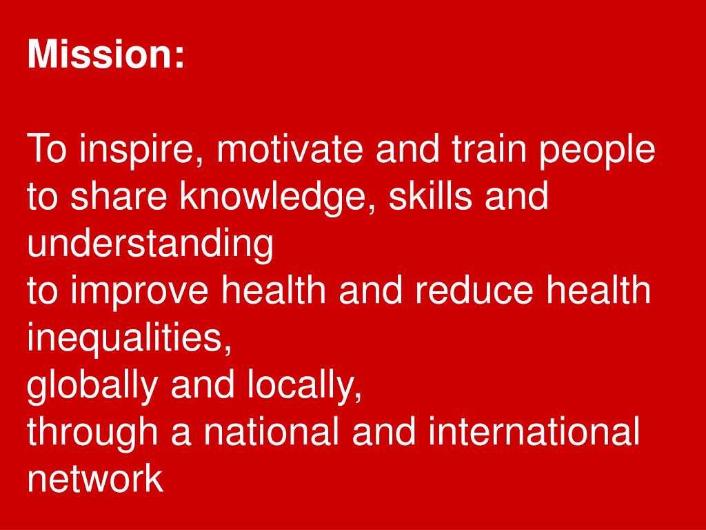 Mission: To inspire, motivate and train people to share knowledge, skills and understanding to improve health and reduce health inequalities, globally and locally, through a national and international network