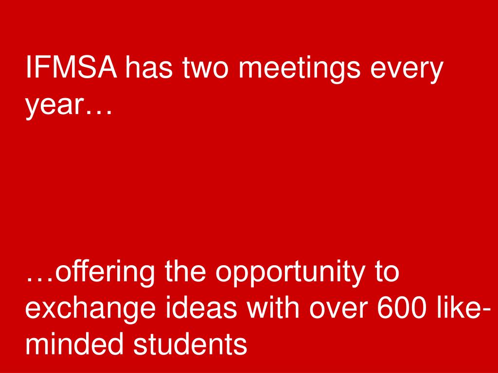 IFMSA has two meetings every year… …offering the opportunity to exchange ideas with over 600 like-minded students