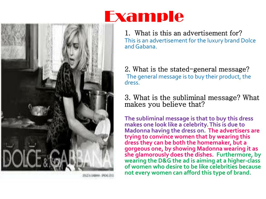 Example • What is this an advertisement for? This is an advertisement for the luxury brand Dolce and Gabana. 2. What is the stated-general message? The general message is to buy their product, the dress. 3. What is the subliminal message? What makes you believe that? The subliminal message is that to buy this dress makes one look like a celebrity. This is due to Madonna having the dress on. The advertisers are trying to convince women that by wearing this dress they can be both the homemaker, but a gorgeous one, by showing Madonna wearing it as she glamorously does the dishes. Furthermore, by wearing the D&G the ad is aiming at a higher-class of women who desire to be like celebrities because not every women can afford this type of brand.