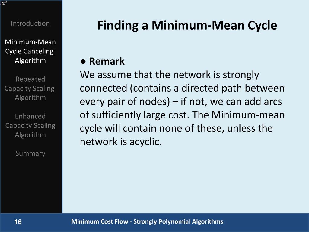 IntroductionMinimum-Mean Cycle Canceling AlgorithmRepeated Capacity Scaling AlgorithmEnhanced Capacity Scaling Algorithm Summary ● Remark We assume that the network is strongly connected (contains a directed path between every pair of nodes) – if not, we can add arcs of sufficiently large cost. The Minimum-mean cycle will contain none of these, unless the network is acyclic. Finding a Minimum-Mean Cycle Minimum Cost Flow - Strongly Polynomial Algorithms