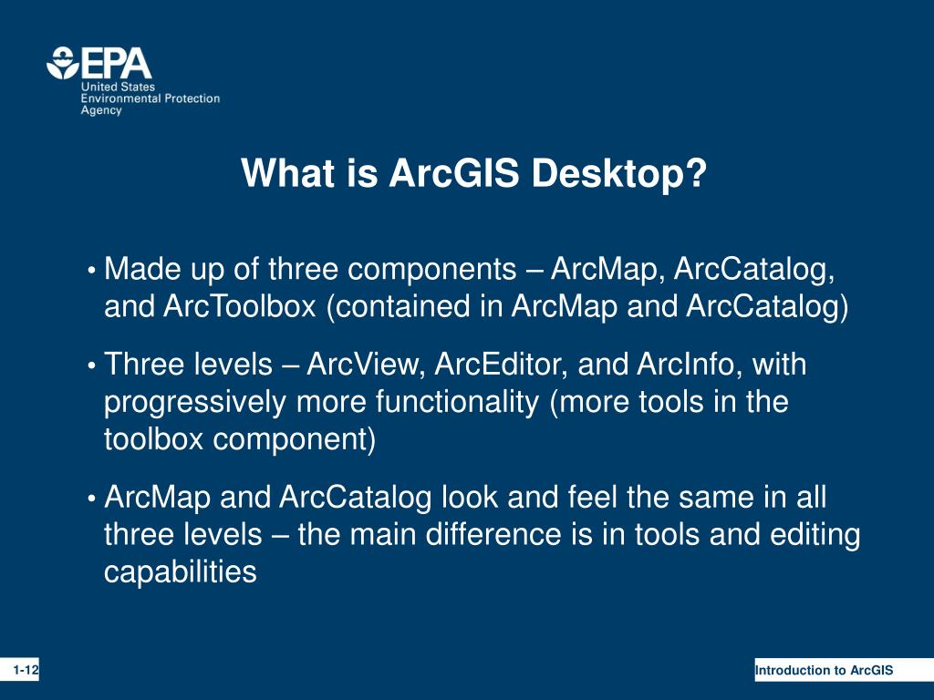 What is ArcGIS Desktop? • Made up of three components – ArcMap, ArcCatalog, and ArcToolbox (contained in ArcMap and ArcCatalog) • Three levels – ArcView, ArcEditor, and ArcInfo, with progressively more functionality (more tools in the toolbox component) • ArcMap and ArcCatalog look and feel the same in all three levels – the main difference is in tools and editing capabilities Introduction to ArcGIS