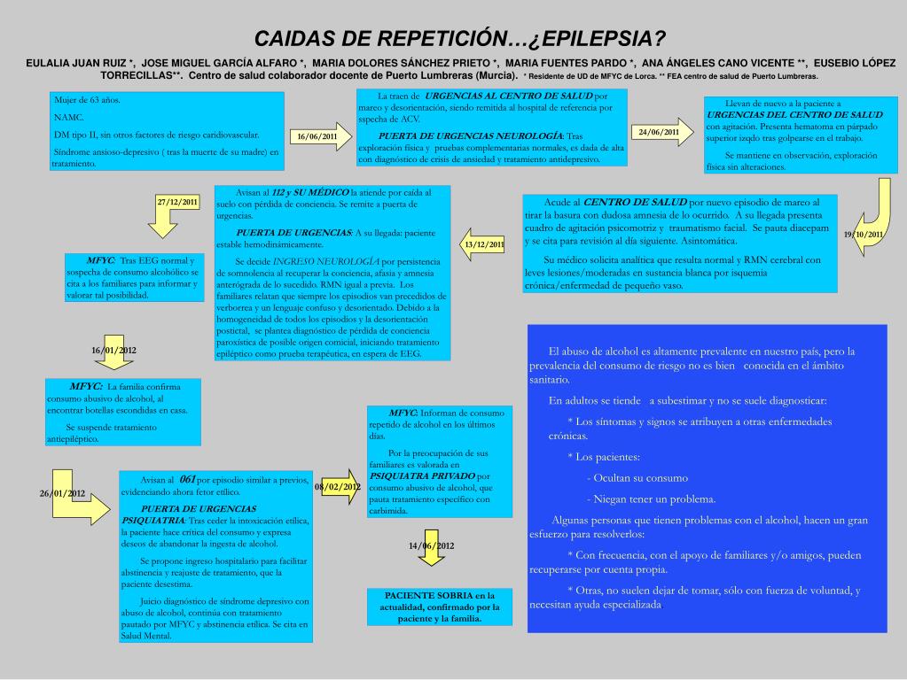 CAIDAS DE REPETICIÓN…¿EPILEPSIA? EULALIA JUAN RUIZ *, JOSE MIGUEL GARCÍA ALFARO *, MARIA DOLORES SÁNCHEZ PRIETO *, MARIA FUENTES PARDO *, ANA ÁNGELES CANO VICENTE **, EUSEBIO LÓPEZ TORRECILLAS**. Centro de salud colaborador docente de Puerto Lumbreras (Murcia). * Residente de UD de MFYC de Lorca. ** FEA centro de salud de Puerto Lumbreras. La traen de URGENCIAS AL CENTRO DE SALUD por mareo y desorientación, siendo remitida al hospital de referencia por sspecha de ACV. PUERTA DEURGENCIAS NEUROLOGÍA: Tras exploración física y pruebas complementarias normales, es dada de alta con diagnóstico de crisis de ansiedad y tratamiento antidepresivo. Mujer de 63 años. NAMC. DM tipo II, sin otros factores de riesgo caridiovascular. Síndrome ansioso-depresivo ( tras la muerte de su madre) en tratamiento. Llevan de nuevo a la paciente a URGENCIAS DEL CENTRO DE SALUD con agitación. Presenta hematoma en párpado superior izqdo tras golpearse en el trabajo. Se mantiene en observación, exploración física sin alteraciones. 24/06/2011 16/06/2011 19/10/2011 Avisan al 112 y SU MÉDICO la atiende por caída al suelo con pérdida de conciencia. Se remite a puerta de urgencias. PUERTA DE URGENCIAS: A su llegada: paciente estable hemodinámicamente. Se decide INGRESO NEUROLOGÍA por persistencia de somnolencia al recuperar la conciencia, afasia y amnesia anterógrada de lo sucedido. RMN igual a previa. Los familiares relatan que siempre los episodios van precedidos de verborrea y un lenguaje confuso y desorientado. Debido a la homogeneidad de todos los episodios y la desorientación postictal, se plantea diagnóstico de pérdida de conciencia paroxística de posible origen comicial, iniciando tratamiento epiléptico como prueba terapéutica, en espera de EEG. 27/12/2011 Acude alCENTRO DE SALUD por nuevo episodio de mareo al tirar la basura con dudosa amnesia de lo ocurrido. A su llegada presenta cuadro de agitación psicomotriz y traumatismo facial. Se pauta diacepam y se cita para revisión al día siguiente. Asintomática. Su médico solicita analítica que resulta normal y RMN cerebral con leves lesiones/moderadas en sustancia blanca por isquemia crónica/enfermedad de pequeño vaso. 13/12/2011 MFYC: Tras EEG normal y sospecha de consumo alcohólico se cita a los familiares para informar y valorar tal posibilidad. • El abuso de alcohol es altamente prevalente en nuestro país, pero la prevalencia del consumo de riesgo no es bien conocida en el ámbito sanitario. • En adultos se tiende a subestimar y no se suele diagnosticar: • * Los síntomas y signos se atribuyen a otras enfermedades crónicas. • * Los pacientes: • - Ocultan su consumo • - Niegan tener un problema. • Algunas personas que tienen problemas con el alcohol, hacen un gran esfuerzo para resolverlos: • * Con frecuencia, con el apoyo de familiares y/o amigos, pueden recuperarse por cuenta propia. • * Otras, no suelen dejar de tomar, sólo con fuerza de voluntad, y necesitan ayuda especializada. 16/01/2012 MFYC:La familia confirma consumo abusivo de alcohol, al encontrar botellas escondidas en casa. Se suspende tratamiento antiepiléptico. MFYC: Informan de consumo repetido de alcohol en los últimos días. Por la preocupación de sus familiares es valorada en PSIQUIATRA PRIVADO por consumo abusivo de alcohol, que pauta tratamiento específico con carbimida. 26/01/2012 08/02/2012 Avisan al 061 por episodio similar a previos, evidenciando ahora fetor etílico. PUERTA DE URGENCIASPSIQUIATRIA: Tras ceder la intoxicación etílica, la paciente hace crítica del consumo y expresa deseos de abandonar la ingesta de alcohol. Se propone ingreso hospitalario para facilitar abstinencia y reajuste de tratamiento, que la paciente desestima. Juicio diagnóstico de síndrome depresivo con abuso de alcohol, continúa con tratamiento pautado por MFYC y abstinencia etílica. Se cita en Salud Mental. 14/06/2012 PACIENTE SOBRIA en la actualidad, confirmado por la paciente y la familia.