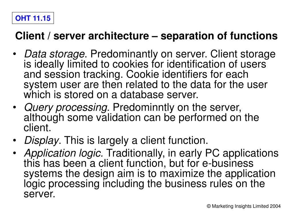 Client / server architecture – separation of functions • Data storage. Predominantly on server. Client storage is ideally limited to cookies for identification of users and session tracking. Cookie identifiers for each system user are then related to the data for the user which is stored on a database server. • Query processing. Predominntly on the server, although some validation can be performed on the client. • Display. This is largely a client function. • Application logic. Traditionally, in early PC applications this has been a client function, but for e-business systems the design aim is to maximize the application logic processing including the business rules on the server.