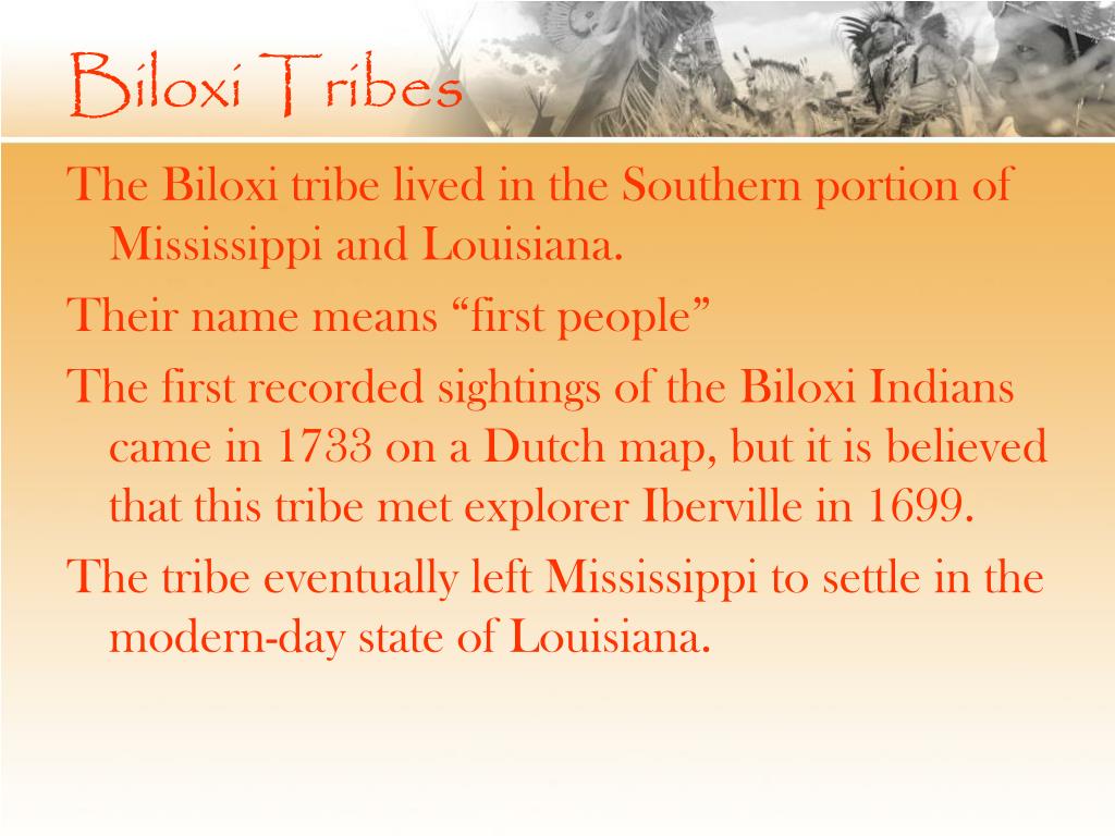 Biloxi Tribes The Biloxi tribe lived in the Southern portion of Mississippi and Louisiana. Their name means “first people” The first recorded sightings of the Biloxi Indians came in 1733 on a Dutch map, but it is believed that this tribe met explorer Iberville in 1699. The tribe eventually left Mississippi to settle in the modern-day state of Louisiana.