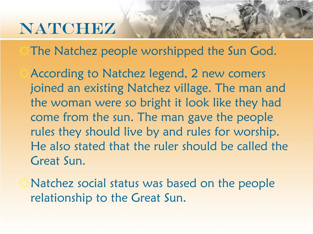 Natchez • The Natchez people worshipped the Sun God. • According to Natchez legend, 2 new comers joined an existing Natchez village. The man and the woman were so bright it look like they had come from the sun. The man gave the people rules they should live by and rules for worship. He also stated that the ruler should be called the Great Sun. • Natchez social status was based on the people relationship to the Great Sun.