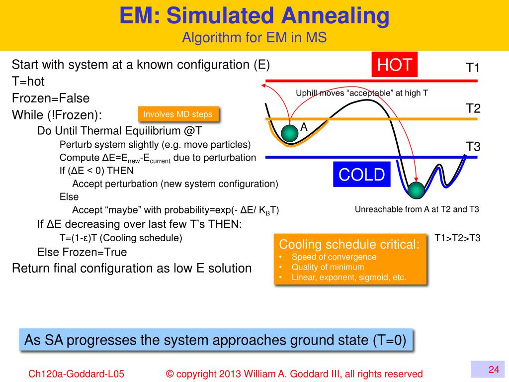 Simulated Annealing A generalization of MC method for examining EOS and frozen states of n-body systems [metropolis et al, 1953] By Thermodynamics Analogy (liquids or metals): a melt, initially at high T and disordered, is slowly cooled (i.e. approximately at thermodynamics equilibrium at any time). As cooling proceeds, system becomes more ordered and approaches a “frozen” ground state at T=0. This reduces defects (induces softness, relieves internal stresses, refines the structure and improves cold working properties of metal). If initial T is too low or cooling is done insufficiently slowly the system may become quenched forming defects or freezing out in metastable states (ie. trapped in a local minimum energy state). Concept: at higher T more configuration become available !! Ground state E S. Kirkpatrick; C. D. Gelatt; M. P. Vecchi, Optimization by Simulated Annealing Science, New Series, Vol. 220, No. 4598. (May 13, 1983), pp. 671-680. 23-AJB