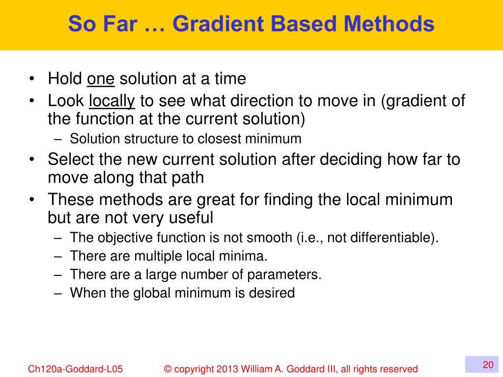 So Far … Gradient Based Methods Hold one solution at a time Look locally to see what direction to move in (gradient of the function at the current solution) Solution structure to closest minimum Select the new current solution after deciding how far to move along that path These methods are great for finding the local minimum but are not very useful The objective function is not smooth (i.e., not differentiable). There are multiple local minima. There are a large number of parameters. When the global minimum is desired