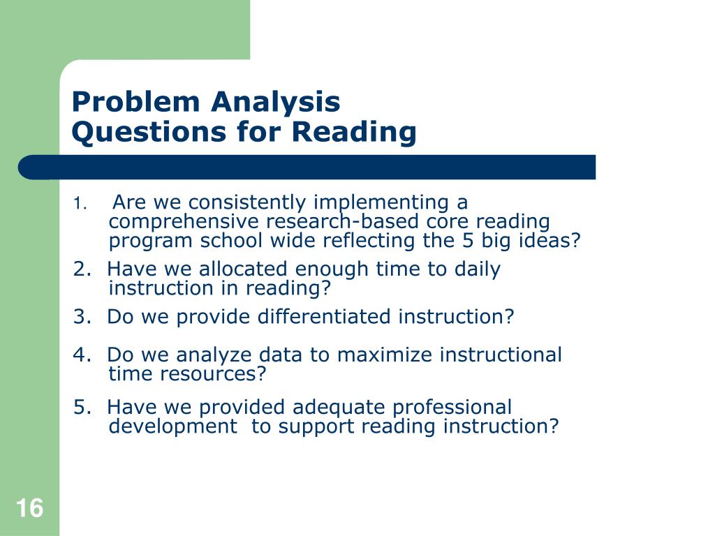 Problem Analysis Questions for Reading 1. Are we consistently implementing a comprehensive research-based core reading program school wide reflecting the 5 big ideas? 2. Have we allocated enough time to daily instruction in reading? 3. Do we provide differentiated instruction? 4. Do we analyze data to maximize instructional time resources? 5. Have we provided adequate professional development to support reading instruction?
