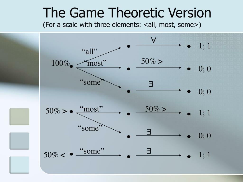 The Game Theoretic Version(For a scale with three elements: <all, most, some>) 1; 1 “all” 50% > 100% “most” 0; 0 “some” 0; 0 “most” 50% > 50% > 1; 1 “some” 0; 0 “some” 50% < 1; 1