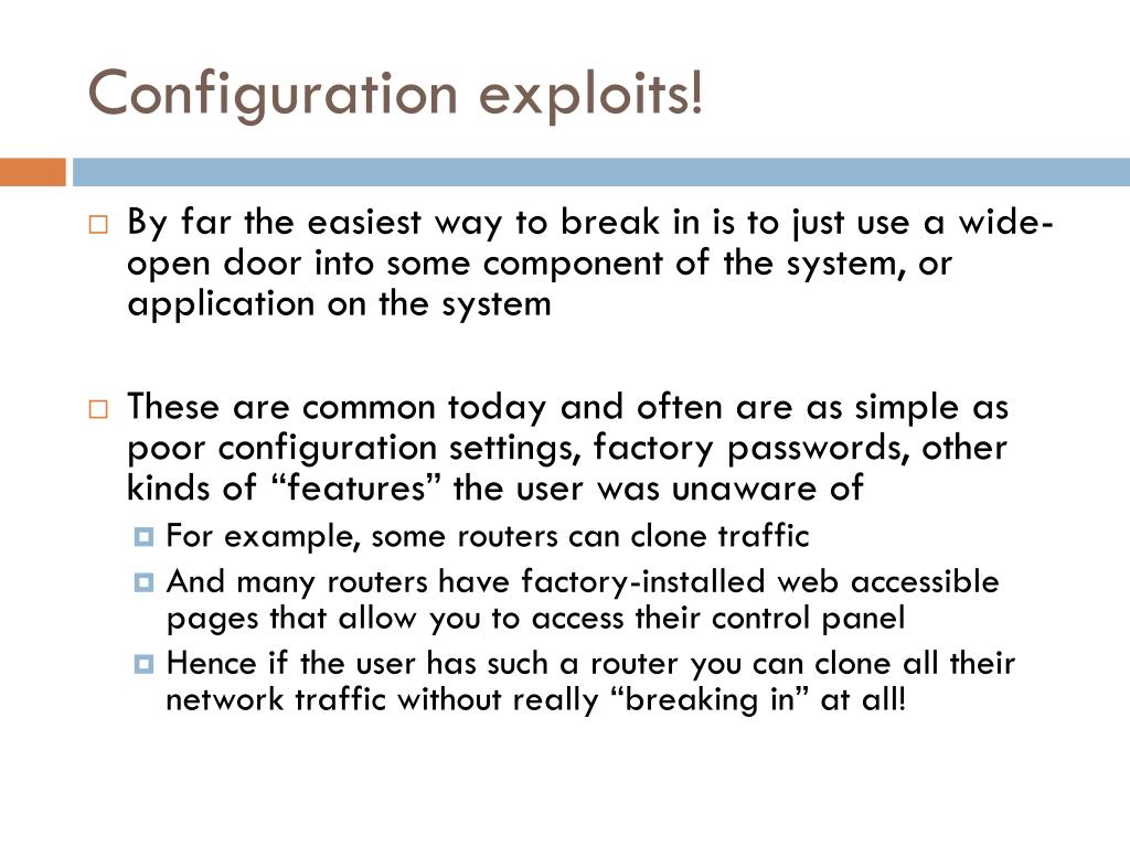 Configuration exploits! • By far the easiest way to break in is to just use a wide-open door into some component of the system, or application on the system • These are common today and often are as simple as poor configuration settings, factory passwords, other kinds of “features” the user was unaware of • For example, some routers can clone traffic • And many routers have factory-installed web accessible pages that allow you to access their control panel • Hence if the user has such a router you can clone all their network traffic without really “breaking in” at all!