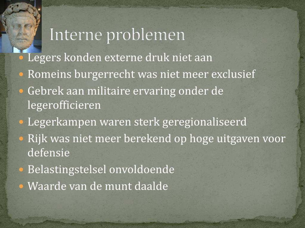 Interne problemen Legers konden externe druk niet aan Romeins burgerrecht was niet meer exclusief Gebrek aan militaire ervaring onder de legerofficieren Legerkampen waren sterk geregionaliseerd Rijk was niet meer berekend op hoge uitgaven voor defensie Belastingstelsel onvoldoende Waarde van de munt daalde