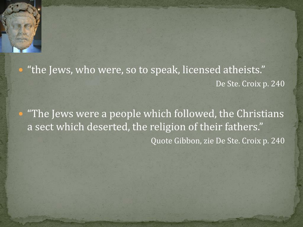 “the Jews, whowere, so to speak, licensedatheists.” De Ste. Croix p. 240 “The Jewswere a peoplewhichfollowed, the Christians a sectwhichdeserted, the religion of theirfathers.” Quote Gibbon, zie De Ste. Croix p. 240