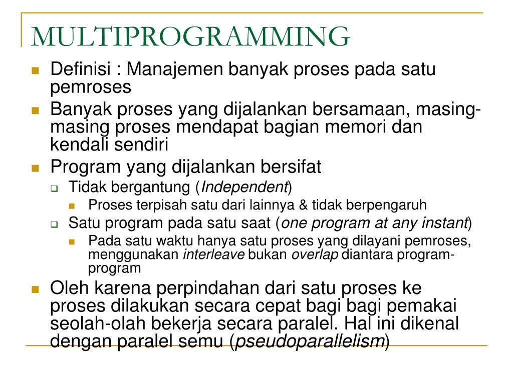 MULTIPROGRAMMING • Definisi : Manajemen banyak proses pada satu pemroses • Banyak proses yang dijalankan bersamaan, masing-masing proses mendapat bagian memori dan kendali sendiri • Program yang dijalankan bersifat • Tidak bergantung (Independent) • Proses terpisah satu dari lainnya & tidak berpengaruh • Satu program pada satu saat (one program at any instant) • Pada satu waktu hanya satu proses yang dilayani pemroses, menggunakan interleave bukan overlap diantara program-program • Oleh karena perpindahan dari satu proses ke proses dilakukan secara cepat bagi bagi pemakai seolah-olah bekerja secara paralel. Hal ini dikenal dengan paralel semu (pseudoparallelism)