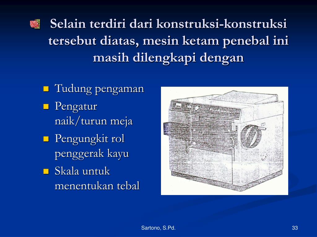 4.1. Penggunaan Mesin Ketam Penebal (Thickness Planer) • Untuk menyelesaikan pengetaman kayu yang telah dikerjakan pada mesin ketam perata, atau dengan kata lain untuk menentukan tebal kayu • Dari penggunaan mesin ketam perata ini kita dapat menarik kesimpulan bahwa mesin ketam penebal ini harus selalu berdampingan dengan mesin ketam perata. • Bahkan ada pabrik yang membuat combinasi dari kedua mesin ini yaitu ketam perata dan ketam penebal. Sartono, S.Pd.