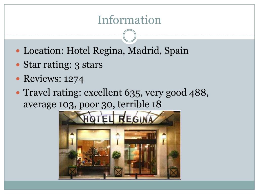 Information Location: Hotel Regina, Madrid, Spain Star rating: 3 stars Reviews: 1274 Travel rating: excellent 635, very good 488, average 103, poor 30, terrible 18