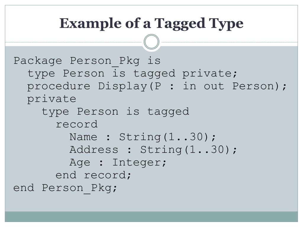 Example of a Tagged Type Package Person_Pkg is type Person is tagged private; procedure Display(P : in out Person); private type Person is tagged record Name : String(1..30); Address : String(1..30); Age : Integer; end record; end Person_Pkg;