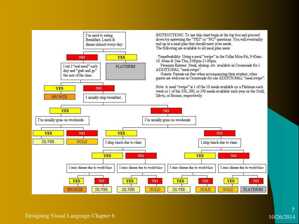 Schematic Representation Some information is nearly impossible to put in linear text form. Take this decision chart used by students at the University of Nevada at Reno to determine the right meal plan for them. Designing Visual Language-Chapter 6