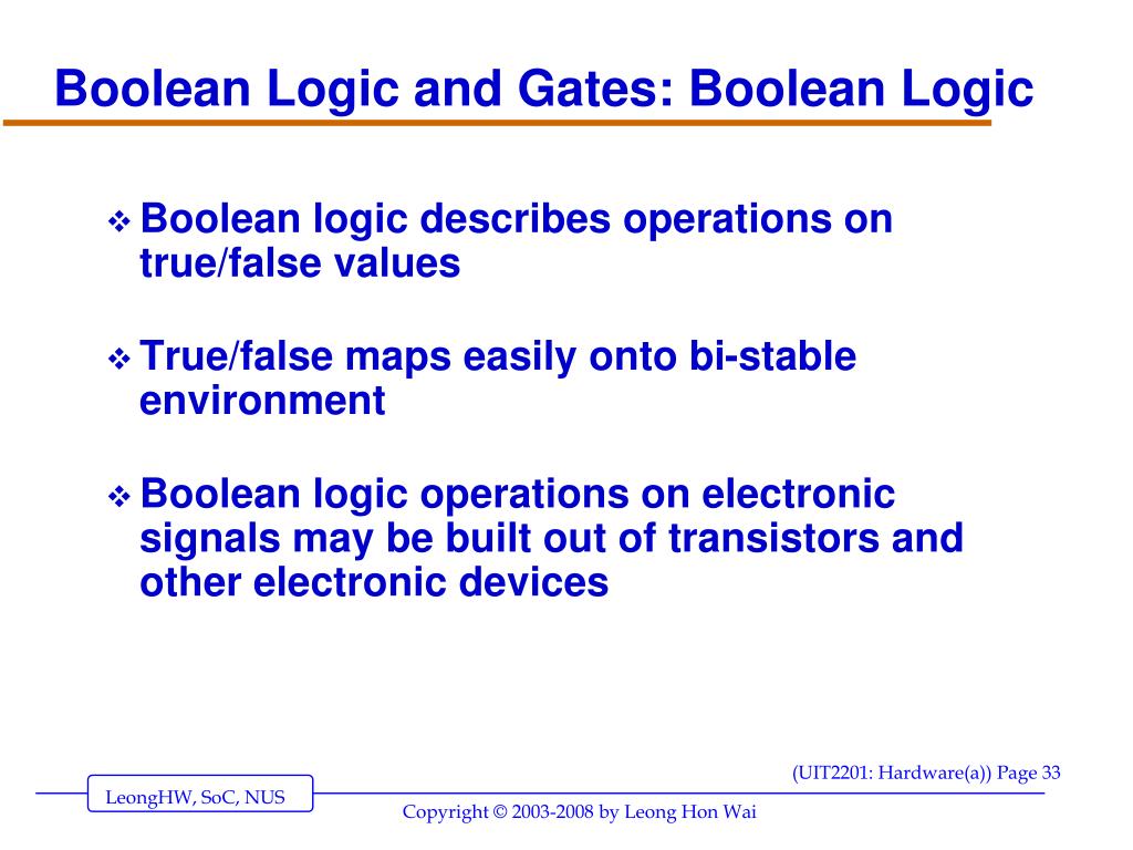 Boolean Logic and Gates: Boolean Logic • Boolean logic describes operations on true/false values • True/false maps easily onto bi-stable environment • Boolean logic operations on electronic signals may be built out of transistors and other electronic devices