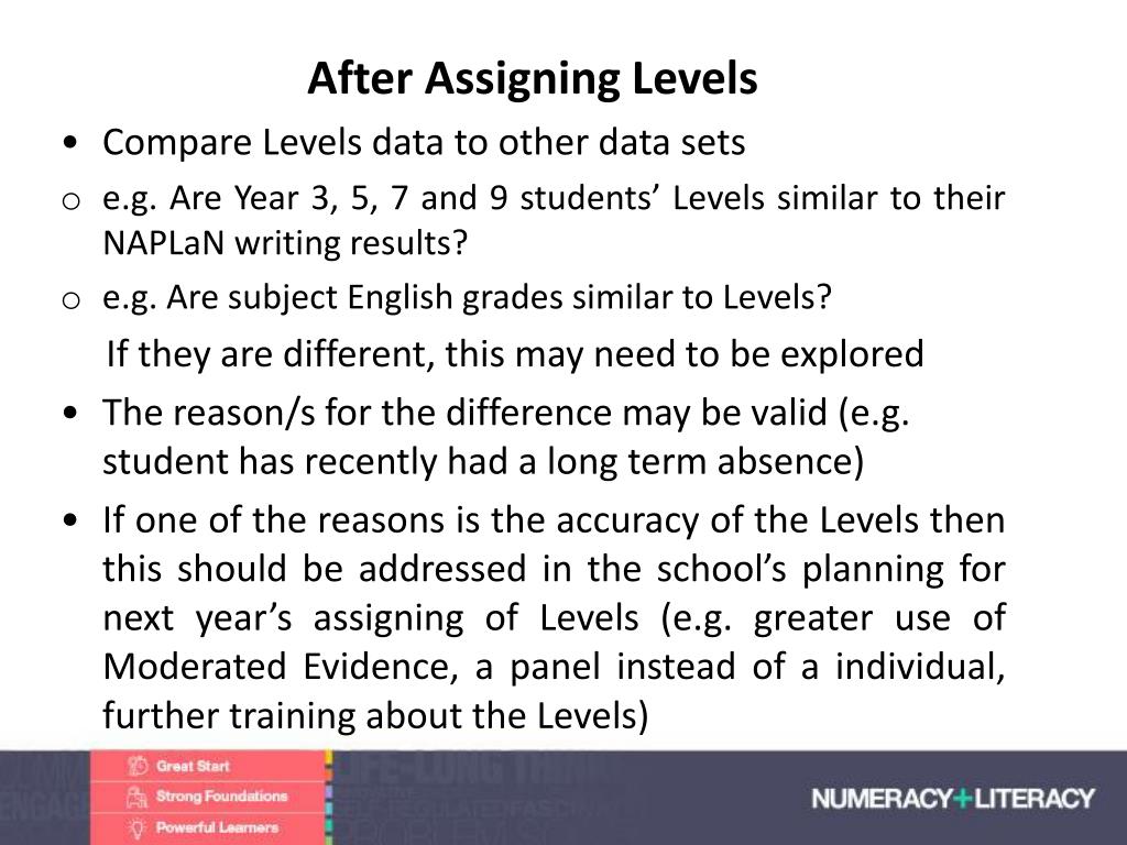 After Assigning Levels • Compare Levels data to other data sets • e.g. Are Year 3, 5, 7 and 9 students’ Levels similar to their NAPLaN writing results? • e.g. Are subject English grades similar to Levels? If they are different, this may need to be explored • The reason/s for the difference may be valid (e.g. student has recently had a long term absence) • If one of the reasons is the accuracy of the Levels then this should be addressed in the school’s planning for next year’s assigning of Levels (e.g. greater use of Moderated Evidence, a panel instead of a individual, further training about the Levels)