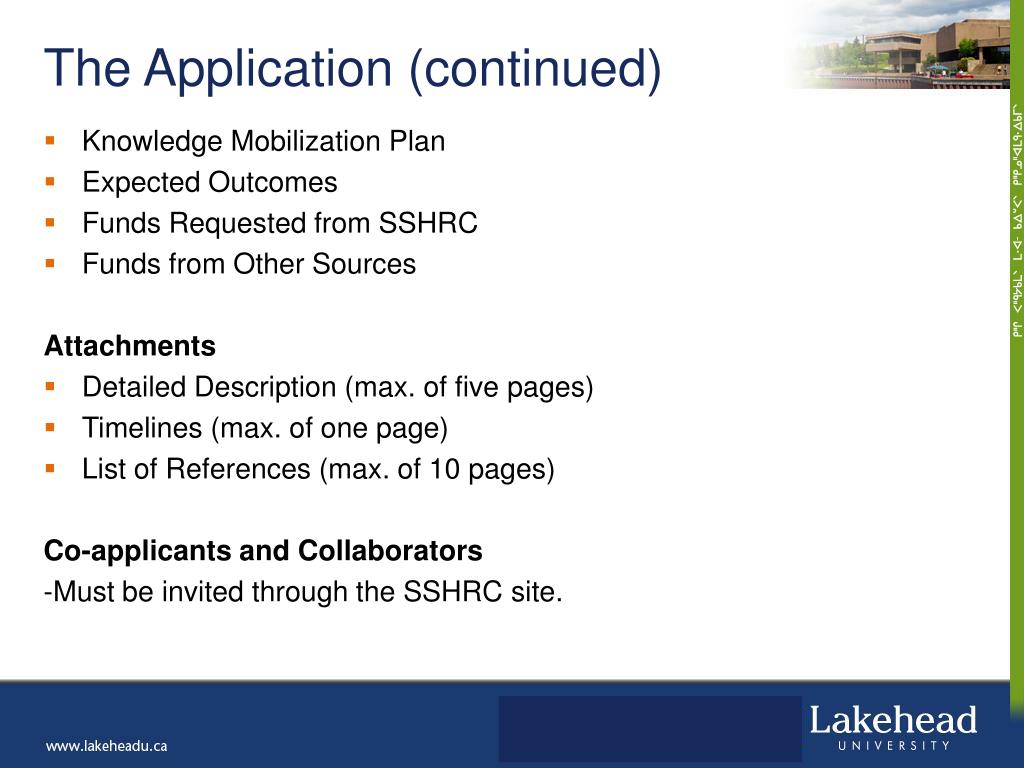 The Application (continued) Knowledge Mobilization Plan Expected Outcomes Funds Requested from SSHRC Funds from Other Sources Attachments Detailed Description (max. of five pages) Timelines (max. of one page) List of References (max. of 10 pages) Co-applicants and Collaborators -Must be invited through the SSHRC site.