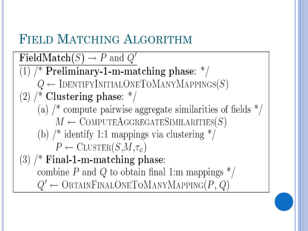 Finding 1:1 Mappings • A hierarchical agglomerative clustering algorithm used to find 1:1 mappings • It takes as input 3 elements : • Set of Interfaces S • Similarity Matrix M of fields in S • Stopping Threshold τc ≥ 0 • Algorithm employs greedy matching • Output of the algorithm is partition over fields such that similar fields are in same partitions.
