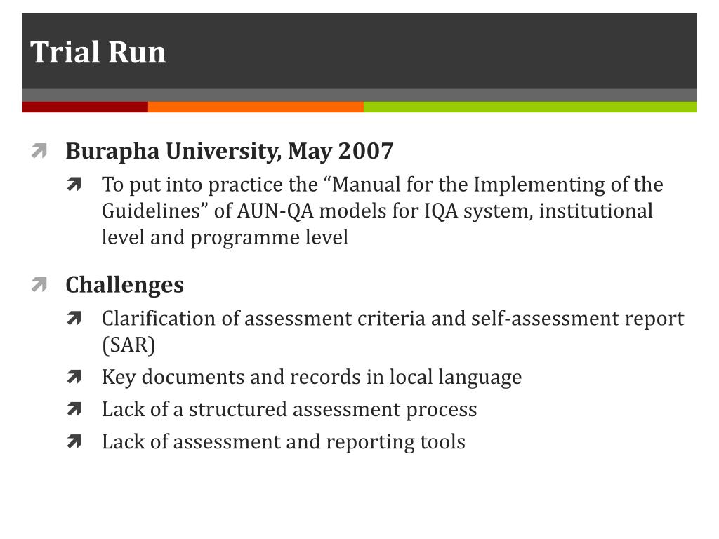 Trial Run • Burapha University, May 2007 • To put into practice the “Manual for the Implementing of the Guidelines” of AUN-QA models for IQA system, institutional level and programme level • Challenges • Clarification of assessment criteria and self-assessment report (SAR) • Key documents and records in local language • Lack of a structured assessment process • Lack of assessment and reporting tools