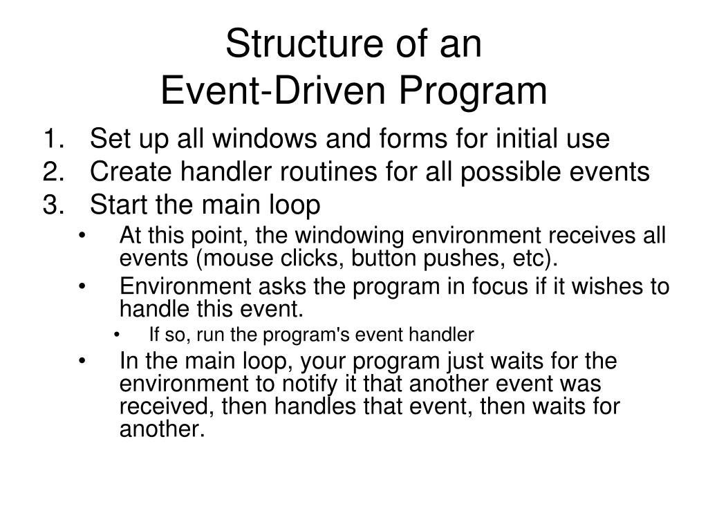 Structure of an Event-Driven Program • Set up all windows and forms for initial use • Create handler routines for all possible events • Start the main loop • At this point, the windowing environment receives all events (mouse clicks, button pushes, etc). • Environment asks the program in focus if it wishes to handle this event. • If so, run the program's event handler • In the main loop, your program just waits for the environment to notify it that another event was received, then handles that event, then waits for another.