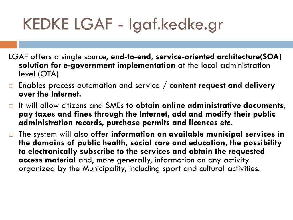 KEDKE LGAF - lgaf.kedke.gr • LGAF offers a single source, end-to-end, service-oriented architecture(SOA) solution for e-government implementation at the local administration level (OTA) • Enables process automation and service / content request and delivery over the Internet. • It will allow citizens and SMEs to obtain online administrative documents, pay taxes and fines through the Internet, add and modify their public administration records, purchase permits and licences etc. • The system will also offer information on available municipal services in the domains of public health, social care and education, the possibility to electronically subscribe to the services and obtain the requested access material and, more generally, information on any activity organized by the Municipality, including sport and cultural activities.