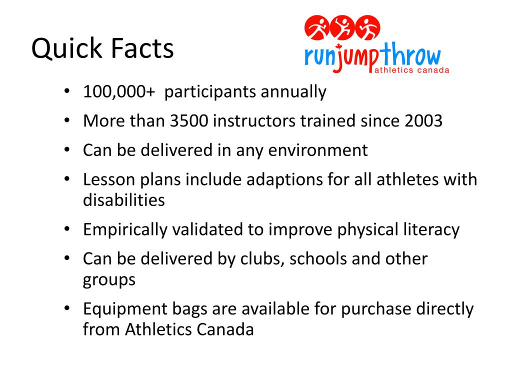 Quick Facts • 100,000+ participants annually • More than 3500 instructors trained since 2003 • Can be delivered in any environment • Lesson plans include adaptions for all athletes with disabilities • Empirically validated to improve physical literacy • Can be delivered by clubs, schools and other groups • Equipment bags are available for purchase directly from Athletics Canada