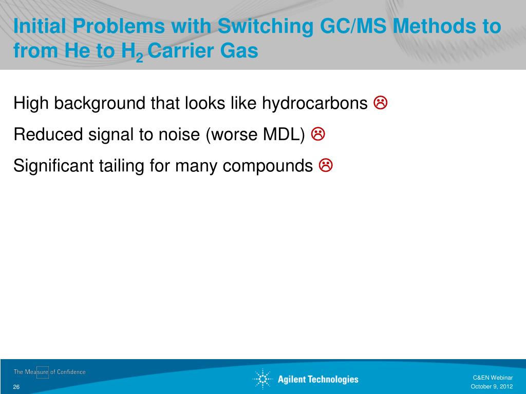 Initial Problems with Switching GC/MS Methods to from He to H2 Carrier Gas • High background that looks like hydrocarbons • Reduced signal to noise (worse MDL) • Significant tailing for many compounds C&EN Webinar