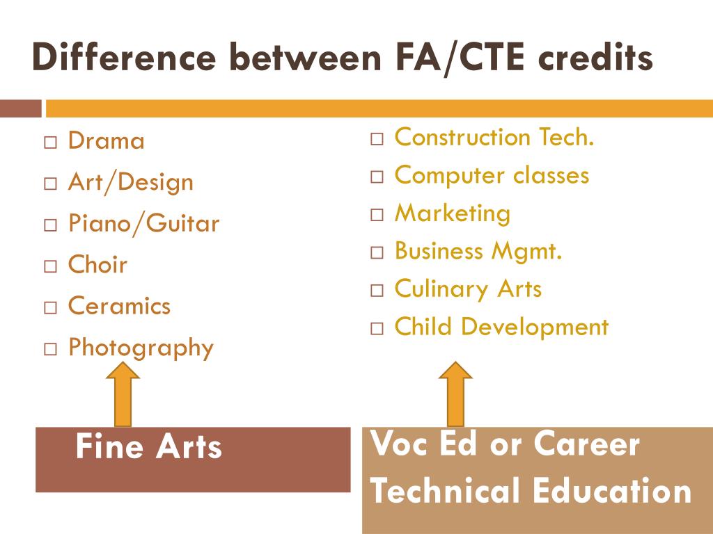 Voc Ed or Career Technical Education Difference between FA/CTE credits Fine Arts • Drama • Art/Design • Piano/Guitar • Choir • Ceramics • Photography • Construction Tech. • Computer classes • Marketing • Business Mgmt. • Culinary Arts • Child Development