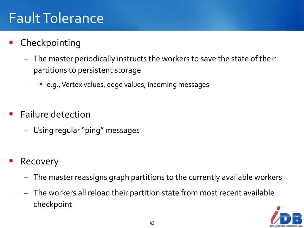 Fault Tolerance • Checkpointing • The master periodically instructs the workers to save the state of their partitions to persistent storage • e.g., Vertex values, edge values, incoming messages • Failure detection • Using regular “ping” messages • Recovery • The master reassigns graph partitions to the currently available workers • The workers all reload their partition state from most recent available checkpoint