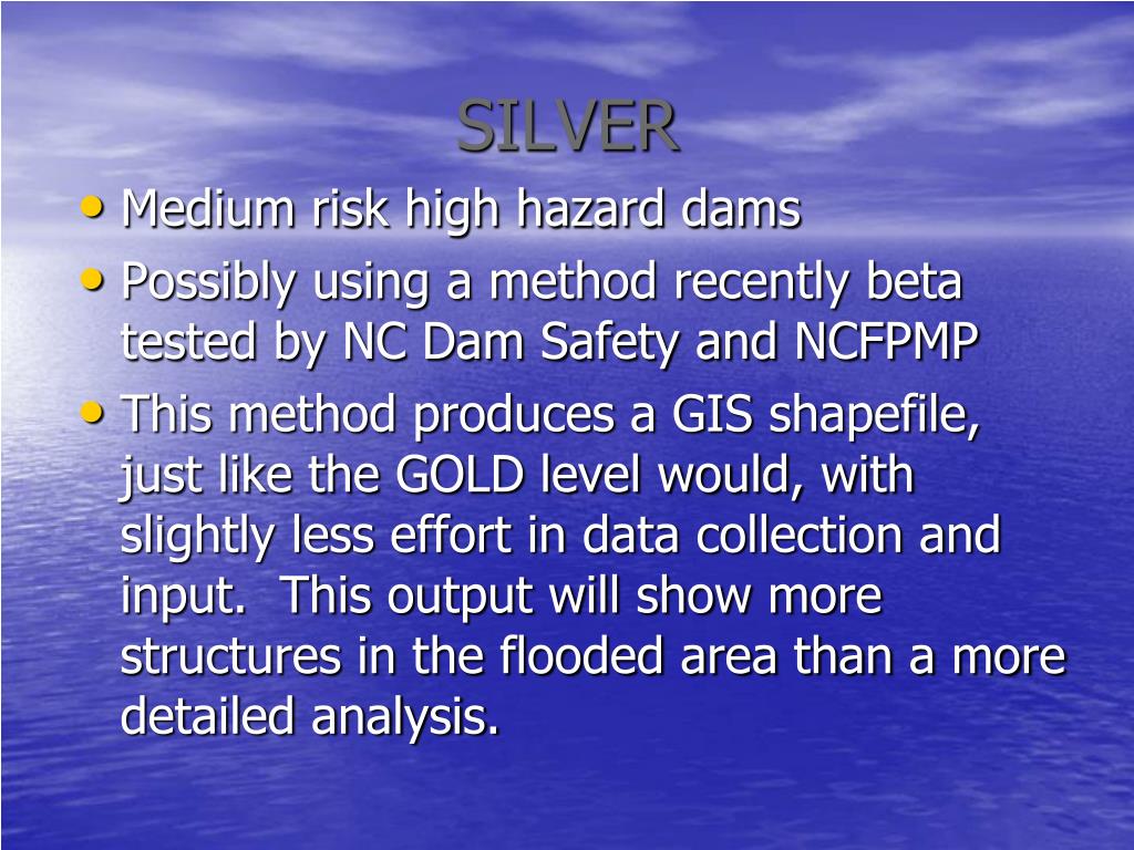 SILVER • Medium risk high hazard dams • Possibly using a method recently beta tested by NC Dam Safety and NCFPMP • This method produces a GIS shapefile, just like the GOLD level would, with slightly less effort in data collection and input. This output will show more structures in the flooded area than a more detailed analysis.