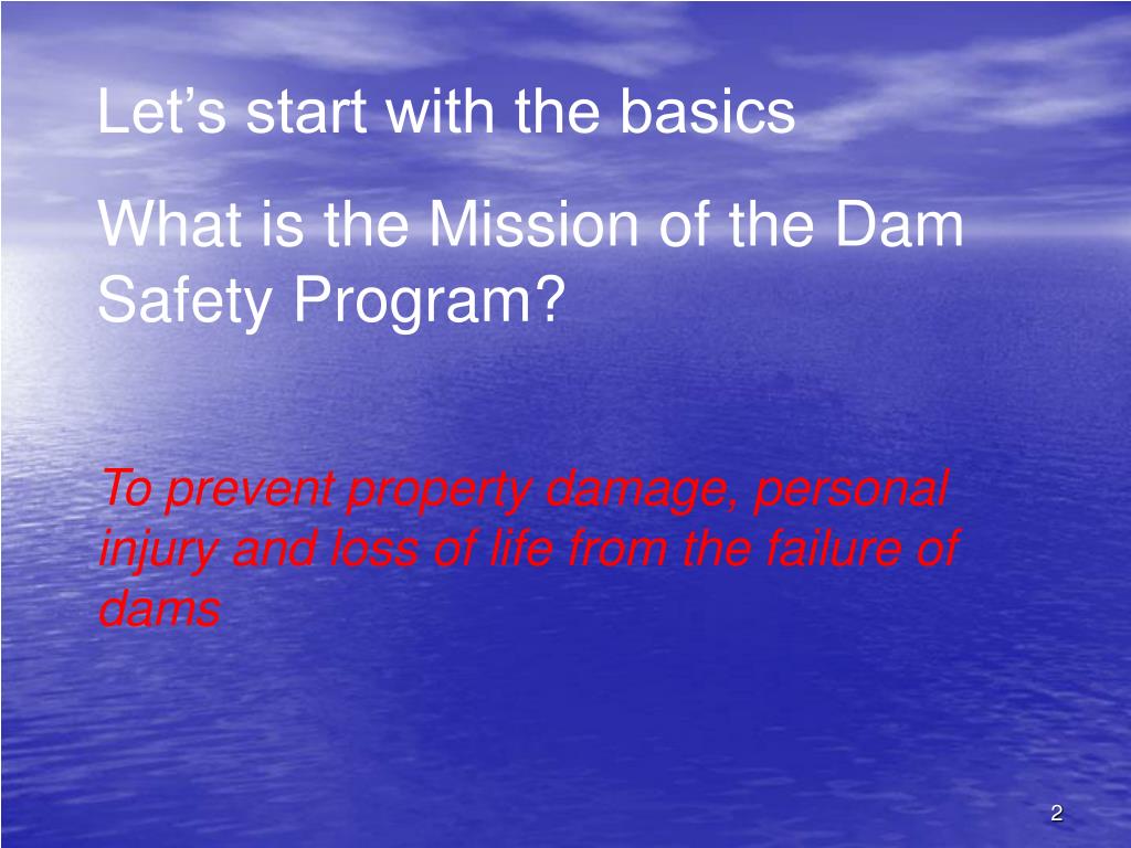 Let’s start with the basics What is the Mission of the Dam Safety Program? To prevent property damage, personal injury and loss of life from the failure of dams